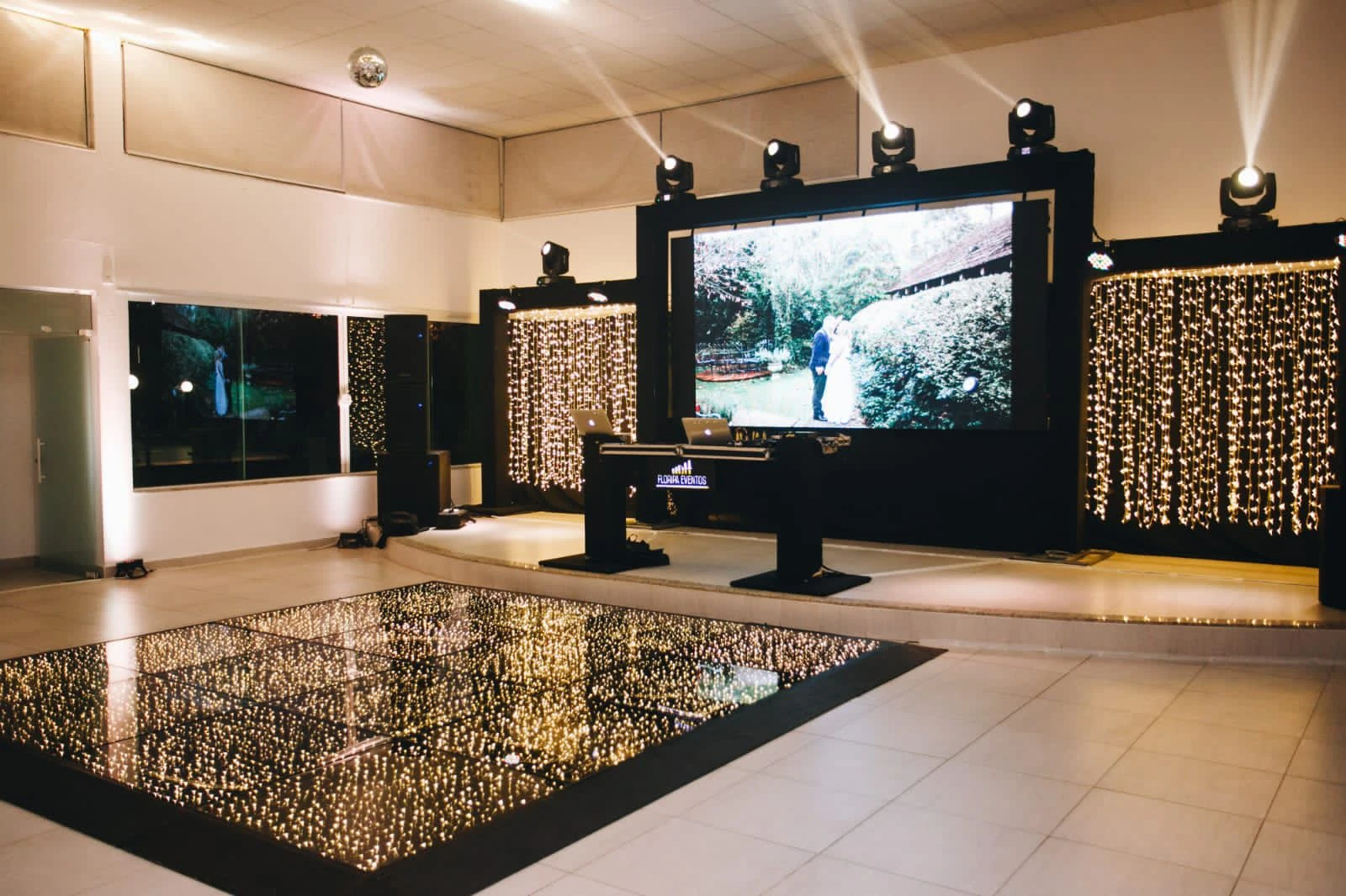 A temperatura de cor das luzes é ajustada de acordo com o estilo do evento, contribuindo para a ambientação desejada.